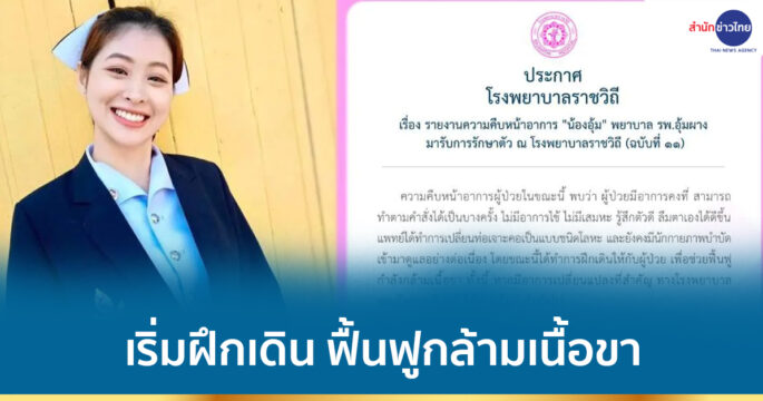 เริ่มฝึกเดินให้ “น้องอุ้ม” พยาบาลอุ้มผาง ฟื้นฟูกล้ามเนื้อขา