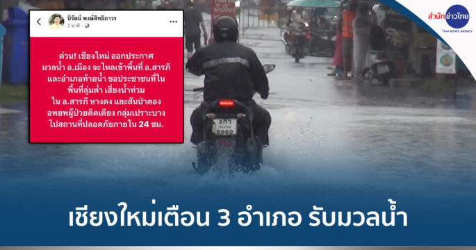เชียงใหม่เตือน อ.สารภี อ.หางดง และ อ.สันป่าตอง เตรียมรับมวลน้ำจาก อ.เมือง อพยพผู้ป่วยติดเตียง กลุ่มเปราะบาง ไปสถานที่ปลอดภัยภายใน 24 ชม.
