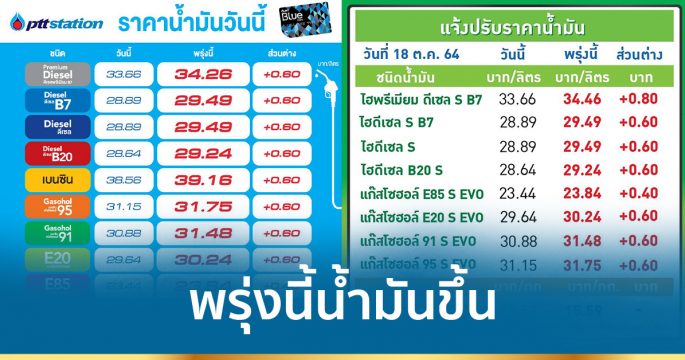 ผู้ค้าแจ้งปรับขึ้นราคาขายปลีกน้ำมันทุกชนิด 60 สตางค์ต่อลิตร เว้น E85 ปรับขึ้น 40 สตางค์ต่อลิตร มีผล 19 ต.ค.64 เวลา 05.00 น. เป็นต้นไป