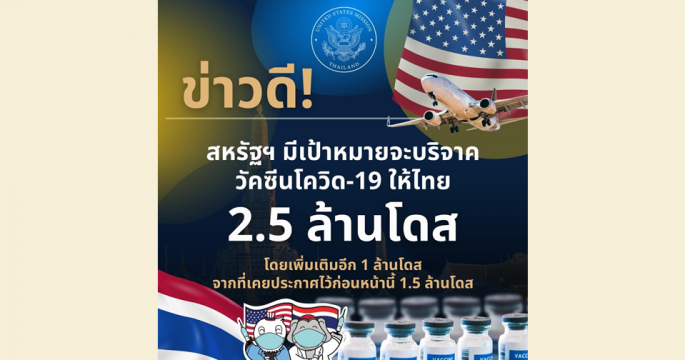 อุปทูตสหรัฐ เผยการบริจาควัคซีนของสหรัฐ ให้ไทย เป็นข้อตกลงแบบรัฐต่อรัฐ ไม่มีคนกลางในการเจรจา เรากำลังทำงานอย่างหนักเพื่อให้คนไทยได้รับวัคซีนที่ปลอดภัยและมีประสิทธิภาพ