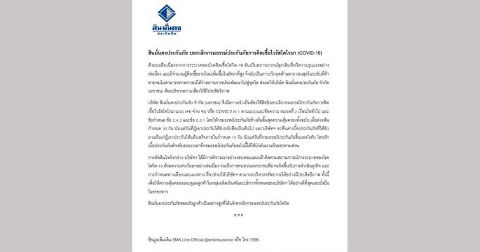 บริษัท สินมั่นคงประกันภัย จำกัด (มหาชน) ประกาศบอกเลิก กรมธรรม์ประกันภัยการติดโควิด-19 แบบ เจอ จ่าย จบ หรือ COVID 2 in 1 คืนเงินลูกค้า ให้เหตุผลผู้ติดเชื้อทวีความรุนแรง ต้องบริหารความเสี่ยงให้มีประสิทธิภาพ