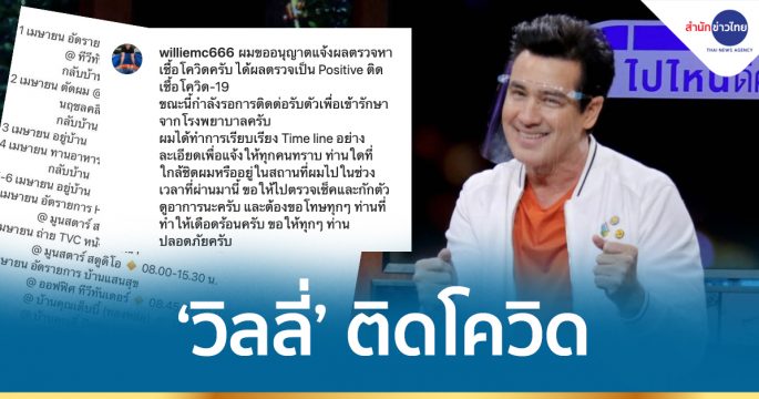 วงการบันเทิงติดเชื้ออีกราย ล่าสุด “วิลลี่ แมคอินทอช” นักแสดงและพิธีกรชื่อดัง ประกาศผ่านอินสตาแกรม แจ้งผลตรวจเป็นบวก ติดโควิด-19 โดยเจ้าตัวทราบข่าว “บอล เชิญยิ้ม” ติดเชื้อ จึงรีบไปตรวจ ก่อนได้รับผลตรวจเมื่อช่วงเช้าวันนี้ (12 เม.ย.)