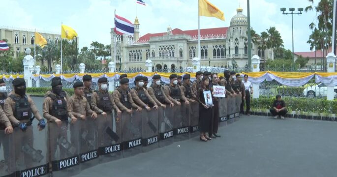 ทำเนียบรัฐบาล 21 พ.ค.- แกนนำทะลุฟ้า บุกทำเนียบ จี้ตรวจสอบการเสียชีวิต “บุ้ง ทะลุวัง” ลั่น ต้องไม่ตายฟรี พร้อมชูป้าย-เปิดคลิปทวงคำพูดแกนนำเพื่อไทย