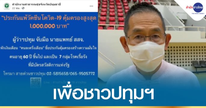 ผู้ว่าฯ ปทุมธานี จับมือนายแพทย์สาธารณสุขจังหวัด หักเงินเดือนคนละครึ่งเดือน ซื้อประกันแพ้วัคซีนโควิด-19 ให้ผู้สูงอายุ และ 7 กลุ่มโรคเรื้อรัง คุ้มครองสูงสุด 1 ล้านบาท