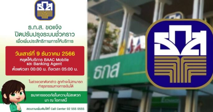 ธ.ก.ส.แจ้งปิดปรับปรุงระบบธุรกรรมชั่วคราว 5 ชั่วโมง ในวันที่ 9 ธ.ค. 66 เวลา 00.00-05.00 น.
