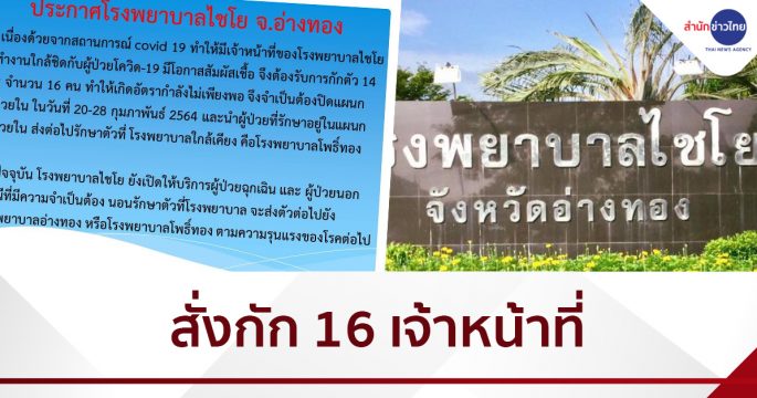 โรงพยาบาลไชโย สั่งกักตัว 16 เจ้าหน้าที่ใกล้ชิดผู้ป่วยโควิด-19 ทำให้อัตรากำลังไม่เพียงพอ ต้องปิดแผนกผู้ป่วยใน 20-28 กุมภาพันธ์ 2564