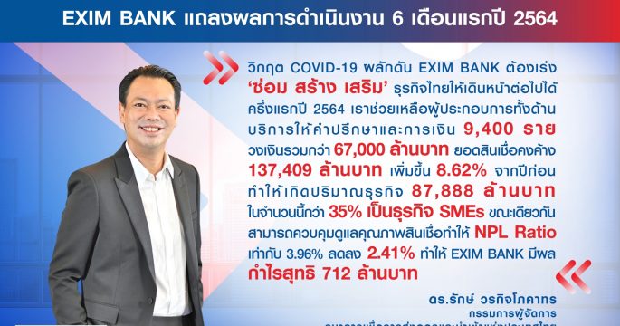 EXIM BANK โชว์ผลงานครึ่งแรกปี 64 ช่วยเหลือผู้ประกอบการกว่า 9,400 ราย