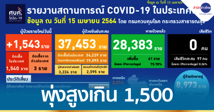 สธ.รายงานยอดป่วยโควิด-19 ประจำวัน (15 เม.ย.) ติดเชื้อเพิ่ม 1,543 ราย สะสม 37,453 ราย ไม่มีผู้เสียชีวิตเพิ่ม
