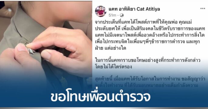 “ผู้กองแคท” โพสต์เฟซบุ๊ก ขอโทษเพื่อนตำรวจทุกฝ่าย