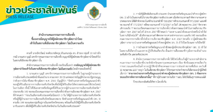กกต. 11 ก.ค.- กกต.ยกคำร้อง 22 ผู้สมัคร สว.ระดับจังหวัดขอนแก่นไม่ลงคะแนนเลือกตัวเอง ชี้ไม่พบเรียกรับประโยชน์แลกคะแนน ผู้สมัครยันเห็นคนอื่นมีคุณสมบัติเหมาะสมกว่า เว็บไซต์สำนักงาน กกต.ได้เผยแพร่คำวินิจฉัย กกต.ยกคำร้องกรณีผู้ร้องกล่าวหาว่าเมื่อวันที่ 9 มิถุนายน 2567 ผู้สมัครรับเลือกเป็นสมาชิกวุฒิสภาระดับจังหวัดของ จ.ขอนแก่น กลุ่มที่2 จำนวน 22 คน นัดพบกันที่ร้านอาหารบ้านโนนเรือง ต.บ้านค้อ อ.เมือง จ.ขอนแก่น ต่อมาในวันเลือกระดับจังหวัด เมื่อวันที่ 16 มิ.ย.67 การลงคะแนนเลือกบุคคลในกลุ่มเดียวกัน ผู้ถูกร้องที่ 1, 2 ,5,10,16,17 และ21 ได้คะแนน 0 คะแนน โดยไม่ลงคะแนนแก่ตนเอง จึงสันนิษฐานว่าผู้ถูกร้องที่ 1-22 จัด ทำ ให้ เสนอให้ สัญญาว่าจะให้ หรือจัด เตรียม จะให้ทรัพย์สิน หรือผลประโยชน์อื่นใดอันอาจคำนวณเป็นเงินได้แก่ผู้ใด เพื่อจูงใจให้ผู้อื่นสมัครเข้ารับเลือกเป็นสมาชิกวุฒิสภา หรือเพื่อจูงใจให้ผู้สมัครหรือผู้มีสิทธิเลือกลงคะแนนหรือไม่ลงคะแนนให้แก่ผู้ใด และเรียก รับ ยอมจะรับเงิน […]