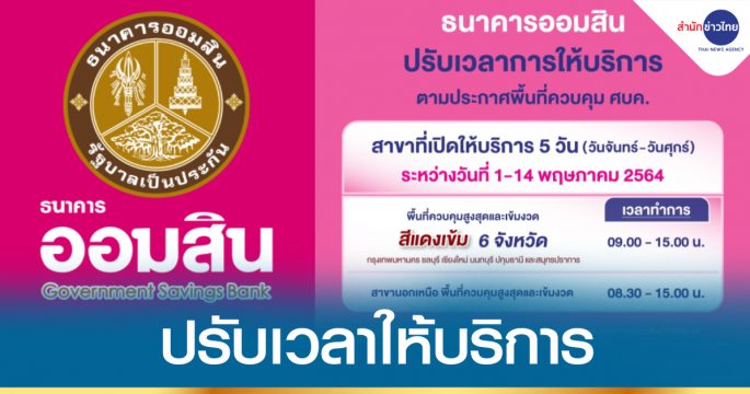ธนาคารออมสิน แจ้งเปลี่ยนแปลงเวลาเปิด-ปิดให้บริการสาขา/หน่วยให้บริการ ในพื้นที่ควบคุมสูงสุดและเข้มงวด (สีแดงเข้ม) เฉพาะสาขาที่เปิดให้บริการ 5 วัน/สัปดาห์ เป็นเวลา 09.00-15.00 น. ตั้งแต่วันที่ 1-14 พ.ค.64 จนกว่าจะมีประกาศเปลี่ยนแปลง