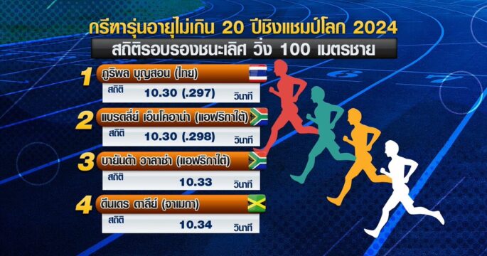 14 ก.ย.- “บิว ภูริพล” คว้าอันดับ 4 ของ Heat 4 ผ่านเข้าสู่รอบรองชนะเลิศ วิ่ง 100 เมตรชาย หนึ่งเดียวในเอเชีย ศึกกรีฑาชิงแชมป์โลก 2025 ญี่ปุ่น ช่วงเย็นวานนี้ (13 ก.ย 68) ณ สนามกีฬาแห่งชาติญี่ปุ่น กรุงโตเกียว ประเทศญี่ปุ่น การแข่งขันกรีฑาชิงแชมป์โลก 2025 (World Athletics Championships 2025) ผลการแข่งขันวิ่ง 100 เมตร ชาย รอบคัดเลือก Heat 4 บิว ภูริพล บุญสอน นักกรีฑาทีมชาติไทย เข้าเส้นชัย ลำดับที่ 4 สถิติ 10.15 วินาที SB ผ่านเข้ารอบกลุ่มเวลาดี q 3 Next Best โดย […]