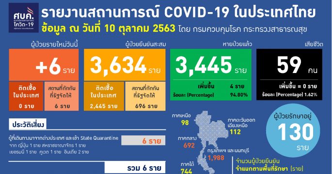 สถานการณ์การติดเชื้อ COVID-19 ในประเทศไทย พบผู้ป่วยรายใหม่ 6 ราย
