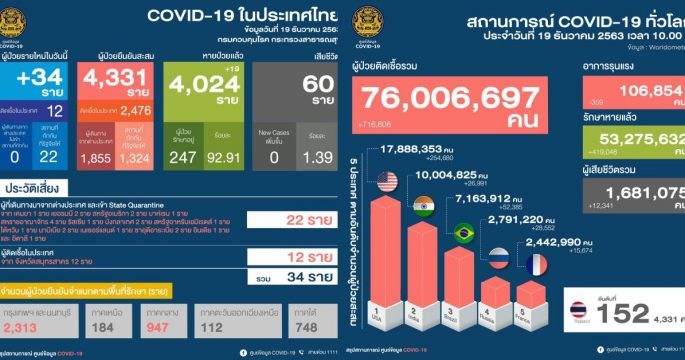 สถานการณ์การติดเชื้อ COVID-19 ในประเทศไทย วันเสาร์ที่ 19 ธันวาคม 2563 พบผู้ป่วยรายใหม่ 34 ราย ผู้ป่วยยืนยันสะสม 4,331 ราย รักษาหายเพิ่ม 19 ราย รวมหายป่วยแล้ว 4,024 ราย ยังรักษาตัวอยู่โรงพยาบาล 247 ราย เสียชีวิตสะสม 60 ราย