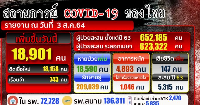 ยืนหมื่นต่อเนื่อง วันนี้ติดเชื้อเพิ่ม 18,901 คน แต่รักษาหายทำสถิติสูงสุด 18,590 คน ขณะที่มีผู้เสียชีวิตอีก 147 คน