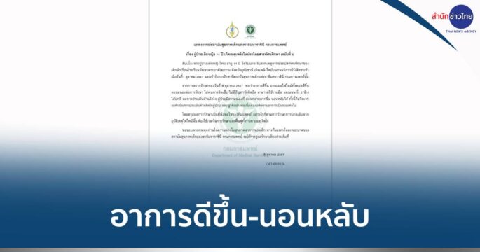 อัปเดตอาการเด็กหญิง 14 ปี เหตุเพลิงไหม้รถทัศนศึกษา พบบาดแผลไฟไหม้ทั้งหมดดีขึ้น ตอบสนองการรักษา อารมณ์คงที่ ผ่อนคลายมากขึ้น นอนหลับ