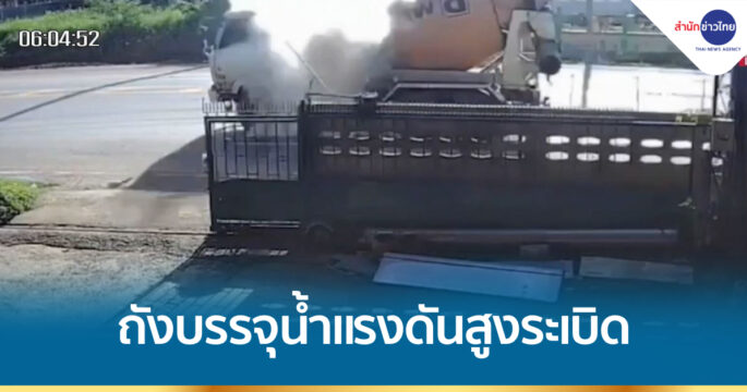 ถังบรรจุน้ำแรงดันสูงรถโม่ปูนระเบิดกลางถนน ฝาปิดถังพุ่งตัดสายไฟฟ้าแรงสูงได้รับความเสียหาย ก่อนหล่นใส่หลังคาโกดังข้างทาง