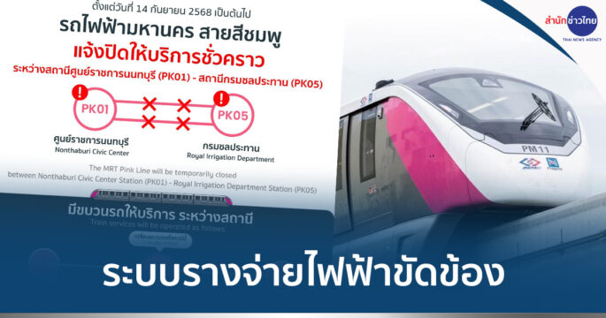 14 ก.ย.- รถไฟฟ้าสายสีชมพู ระบบรางจ่ายไฟฟ้าขัดข้อง ปิดให้บริการชั่วคราวตั้งแต่สถานีศูนย์ราชการนนทบุรี-สถานีกรมชลประทาน เพจรถไฟฟ้ามหานครสายสีชมพู ชี้แจงว่า สาเหตุมาจากระบบรางจ่ายไฟฟ้าขัดข้อง เมื่อช่วงค่ำของวันที่ 13 กันยายนที่ผ่านมา จึงมีความจำเป็นต้องปิดให้บริการเดินรถไฟฟ้ามหานคร สายสีชมพู ตั้งแต่สถานีศูนย์ราชการนนทบุรี ถึงสถานีกรมชลประทาน ชั่วคราว ส่วนขบวนรถไฟฟ้าจากสถานีแยกปากเกร็ด ถึงสถานีมีนบุรี ยังให้บริการตามปกติ แต่ต้องเปลี่ยนขบวนรถที่สถานีโทรคมนาคมแห่งชาติ มีขบวนรถไฟฟ้าให้บริการทุก 15 นาที -สำนักข่าวไทย