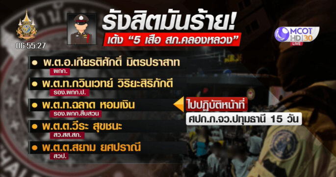 ผู้การปทุมธานี สั่งย้าย 5 เสือ สภ.คลองหลวง เซ่นปฏิบัติการ “รังสิตมันร้าย” ด้านผู้ว่าฯ เอาจริง เรียก ผกก.ทั้ง 14 โรงพัก นายอำเภอทั้งจังหวัด รวมทั้งผู้ประกอบการ 234 แห่ง ทำเอ็มโอยูการบังคับใช้กฎหมาย