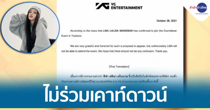 วายจี เอ็นเตอร์เทนเมนต์ ต้นสังกัดของ “ลิซ่า” ออกแถลงลิซ่าไม่สามารถเข้าร่วมงานเคาท์ดาวน์ปีใหม่ จ.ภูเก็ต เนื่องจากตารางงานถูกกำหนดไว้แล้ว