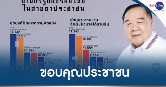 “ลุงป้อม” ขอบคุณประชาชน โหวตเป็นนายกฯ โดดเด่น “ก้าวข้ามความขัดแย้ง – นำจัดตั้งรัฐบาลราบรื่น” เตรียมประเดิมภารกิจสมานฉันท์ ตั้งกก.คัดเลือกนโยบายเด็ดแต่ละพรรคมาทำมให้เกิดขึ้นจริง ย้ำอายุไม่ใช่อุปสรรคการขึ้นผู้นำรัฐบาล แม้จะเดินช้า แต่คิดเร็ว ทำเร็ว ความโสดจะทำให้ทำงานเพื่อบ้านเมืองได้เต็มที่