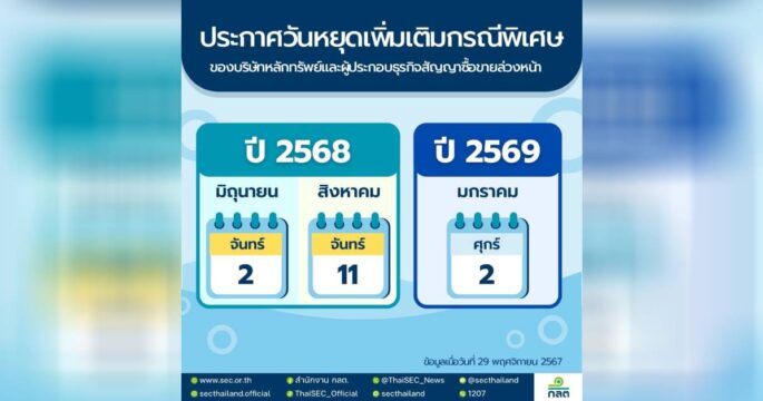 ก.ล.ต. กำหนดวันหยุดทำการเพิ่มเติมเป็นกรณีพิเศษ