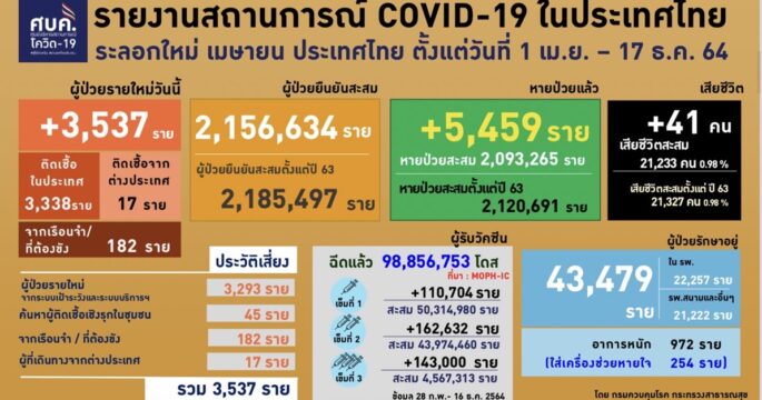 ศบค.เผยผู้ติดเชื้อโควิด-19 รายใหม่ 248 ราย 17/03/2564 12:33 FacebookFacebookXTwitterLINELine 45 ศบค.เผยผู้ติดเชื้อโควิด-19 รายใหม่ 248 ราย กทม. 167 ราย ส่วนใหญ่โยงตลาดบางแค