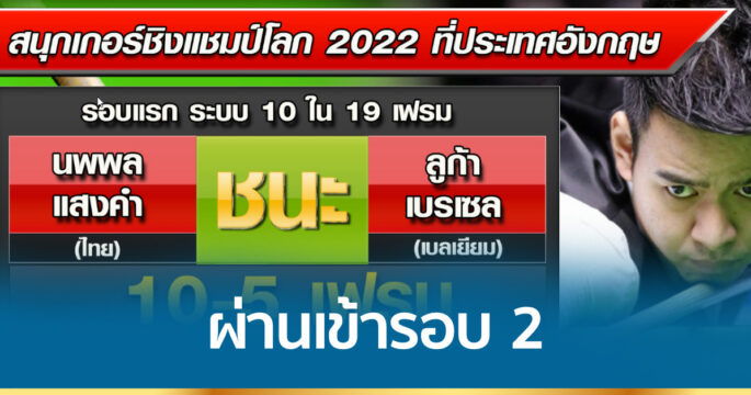 “หมู ปากน้ำ” นพพล แสงคำ มือ 38 ของโลก ชนะ “เบรเซล” จากเบลเยียม 10-5 เฟรม ผ่านเข้ารอบ 2 ไปพบ จอห์น ฮิกกิ้นส์ อดีตแชมป์โลก 4 สมัยจากสกอตแลนด์