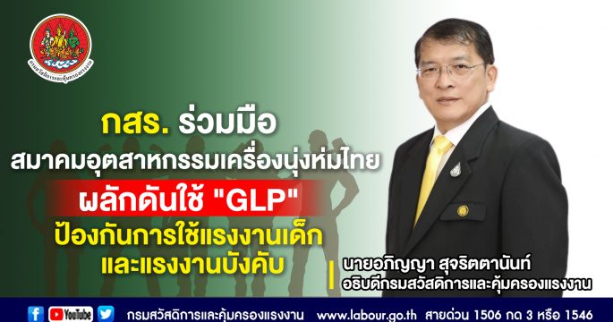 กรมสวัสดิการและคุ้มครองแรงงานร่วมกับสมาคมอุตสาหกรรมเครื่องนุ่งห่มไทย เปิดอบรมออนไลน์ เพิ่มศักยภาพผู้ประกอบการในภาคอุตสาหกรรมเครื่องนุ่งห่ม ได้นำแนวปฏิบัติการใช้แรงงานที่ดี (Good Labour Practices : GLP) ไปใช้ในการบริหารจัดการแรงงาน ผลิตสินค้าที่ไม่มีการใช้แรงงานเด็กและแรงงานบังคับ