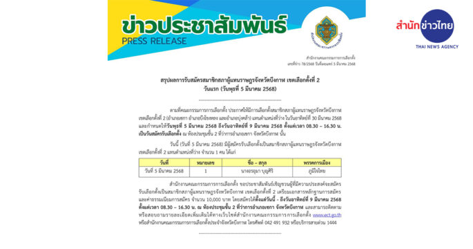 กกต.กำหนดเลือกตั้งซ่อม สส.เขต 2 บึงกาฬ 30 มี.ค. เปิดรับสมัคร 5-9 มี.ค.นี้