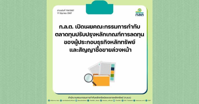 ก.ล.ต. เปิดเผยคณะกรรมการกำกับตลาดทุนปรับปรุงหลักเกณฑ์การลดทุนของผู้ประกอบธุรกิจหลักทรัพย์และสัญญาซื้อขายล่วงหน้า มีผลบังคับตั้งแต่ 16 มิ.ย.67