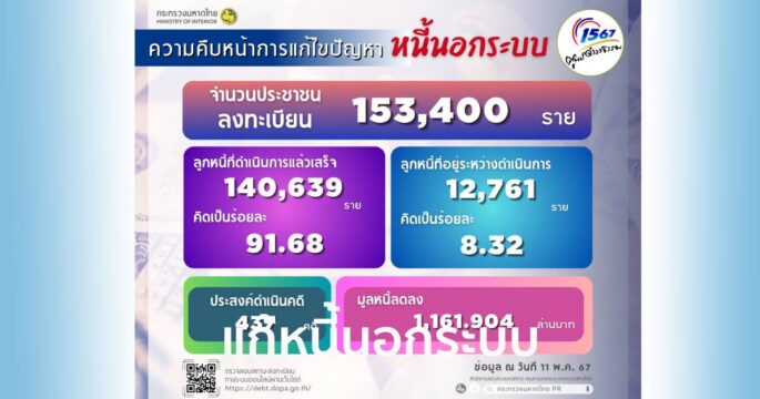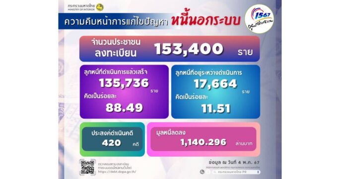 มหาดไทย เผยผลการลงทะเบียนหนี้นอกระบบ 27 วัน ประชาชนลงทะเบียนแล้ว 111,700 ราย มูลหนี้ 7,162 ล้านบาท ไกล่เกลี่ยสำเร็จแล้ว 703 ราย มูลหนี้ลดลงร่วม 90 ล้านบาท