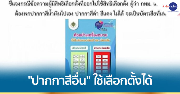 กกต. ชี้แจงกรณีใช้ปากกาสีอื่นไม่ได้ จะเป็นบัตรเสียทันทีนั้น ขอยืนยันว่าหากปรากฏว่ามีการใช้ปากกาสีอื่นก็ไม่ได้หมายความว่าจะเป็นบัตรเสีย เนื่องจากไม่มีกฎหมายหรือระเบียบห้ามไว้