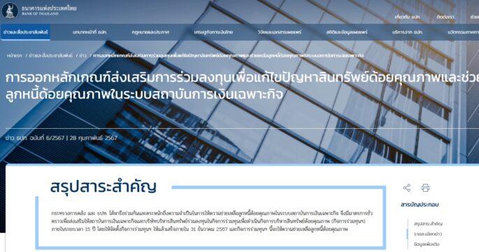 กรุงเทพฯ 28 ก.พ.-กระทรวงการคลัง และ ธปท. ช่วยเหลือลูกหนี้ด้อยคุณภาพในระบบสถาบันการเงินเฉพาะกิจ จึงมีมาตรการชั่วคราวเพื่อส่งเสริมให้สถาบันการเงินเฉพาะกิจและบริษัทบริหารสินทรัพย์(AMC )ร่วมลงทุนในกิจการร่วมทุนเพื่อดำเนินกิจการบริหารสินทรัพย์ด้อยคุณภาพ (กิจการร่วมทุนฯ) ภายในระยะเวลา 15 ปี โดยให้จัดตั้งกิจการร่วมทุนฯ ให้แล้วเสร็จภายใน 31 ธันวาคม 2567