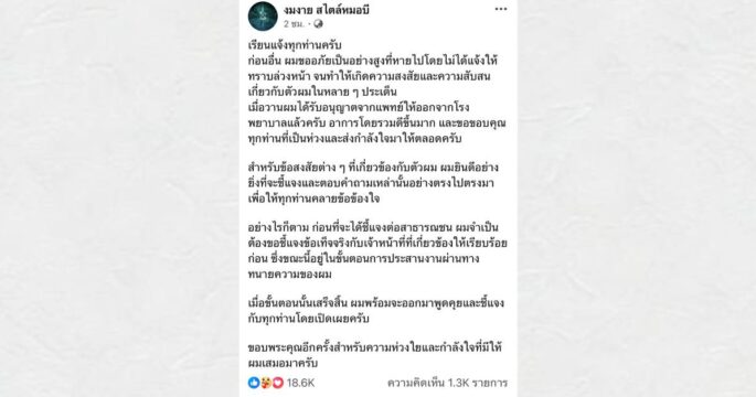“หมอบี” โพสต์ออกจาก รพ.แล้ว พร้อมแจงข้อสงสัยหลายประเด็น