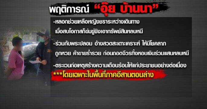 สืบนครบาล รวบ “อุ๊ย บ้านนา” ออกอุบายช่วยเหลือรับส่งคนชราก่อนชิงทรัพย์หลบหนี อีกทั้งเอี่ยวขบวนการตระเวนหลอกสะเดาะเคราะห์ถอดจีวรหนีต่อเนื่องพื้นที่อีสานใต้