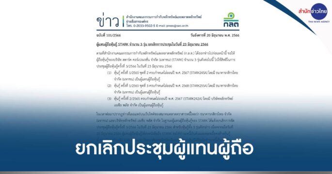 ผู้แทนผู้ถือหุ้นกู้ STARK จำนวน 3 รุ่น ยกเลิกการประชุมในวันที่ 23 มิถุนายน 2566