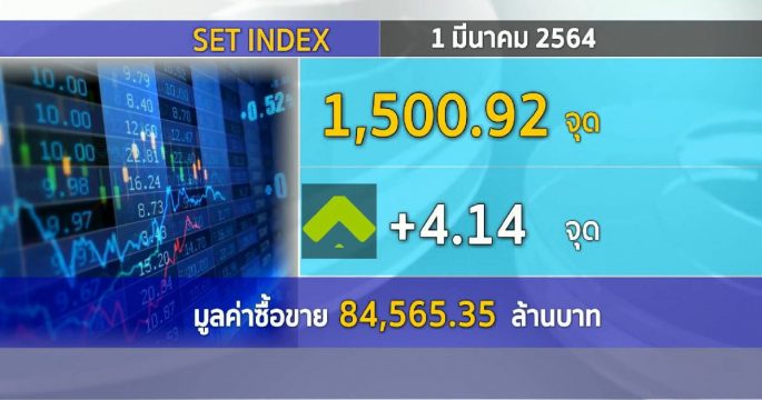 ตลาดหลักทรัพย์ปิดวันนี้ที่ระดับ 1,500.92 จุด เพิ่มขึ้น 4.14 จุด (+0.28%) มูลค่าการซื้อขาย 84,565.35 ล้านบาท ยืนแกร่งเหนือ 1,500 รับแรงหนุนหุ้นเกี่ยวข้องเศรษฐกิจฟื้น