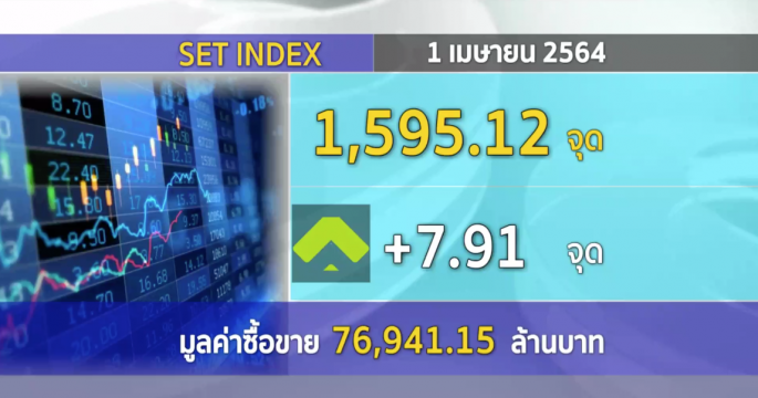 ตลาดหลักทรัพย์ปิดวันนี้ที่ระดับ 1,595.12 จุด เพิ่มขึ้น 7.91 จุด (+0.50%) มูลค่าการซื้อขาย 76,941.15 ล้านบาท ตามต่างประเทศ บนความคาดหวังเศรษฐกิจฟื้น