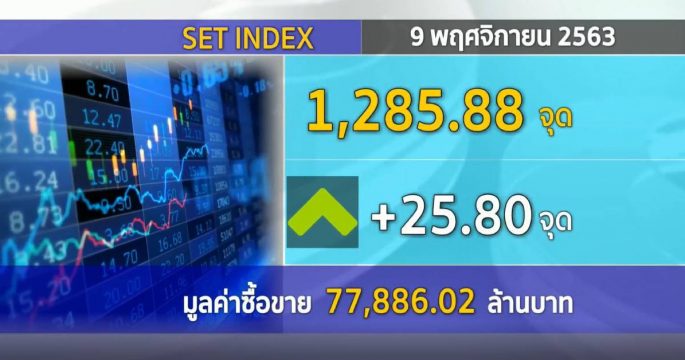 ตลาดหลักทรัพย์วันนี้ 9 พ.ย.63 ปิดที่ระดับ 1,285.88 จุด บวก 25.80 จุด มูลค่า 77,886.02 ล้านบาท