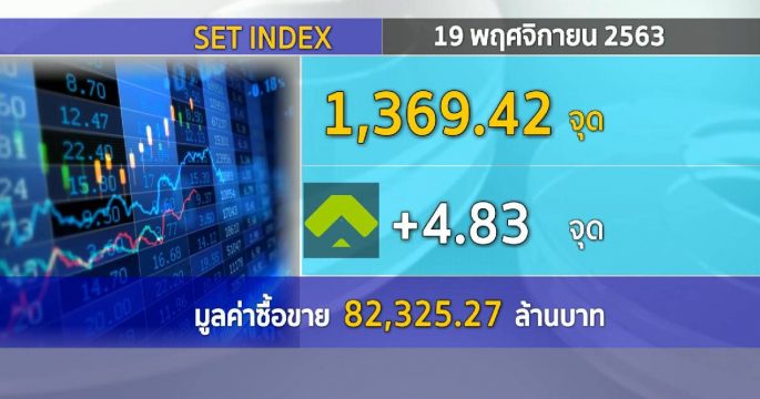 ตลาดหลักทรัพย์ปิดวันนี้ที่ระดับ 1,369.42 จุด เพิ่มขึ้น 4.83 จุด (+0.35%) มูลค่าการซื้อขาย 82,325.27 ล้านบาท