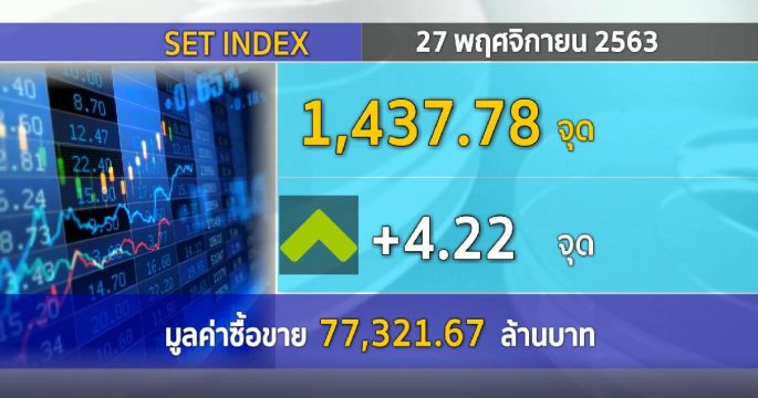 ตลาดหลักทรัพย์ปิดวันนี้ที่ระดับ 1,437.78 จุด เพิ่มขึ้น 4.22 จุด (+0.29%) มูลค่าการซื้อขาย 77,321.67 ล้านบาท
