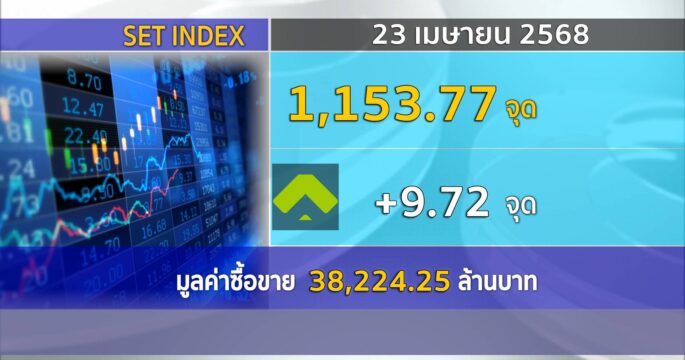 กทม. 23 พ.ค.-SET ปิดวันนี้ที่ 1,176.36 จุด เพิ่มขึ้น 2.99 จุด (+0.25%) มูลค่าการซื้อขาย 34,683.81 ล้านบาท การซื้อขายหุ้นวันนี้ ดัชนีปรับขึ้นช่วงเช้าก่อนลดช่วงบวก โดยทำจุดต่ำสุด 1,173.54 จุด และทำจุดสูงสุด 1,184.86 จุด ส่วนหลักทรัพย์เปลี่ยนแปลงวันนี้เพิ่มขึ้น 259 หลักทรัพย์ ลดลง 206 หลักทรัพย์ และไม่เปลี่ยนแปลง 190 หลักทรัพย์.-สำนักข่าวไทย