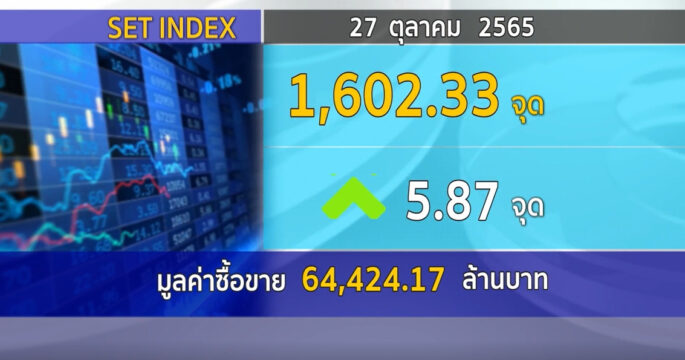 ตลาดหลักทรัพย์ ปิดวันนี้ที่ระดับ 1,602.33 จุด เพิ่มขึ้น 5.87 จุด (+0.37%) มูลค่าการซื้อขาย 64,424.17 ล้านบาท