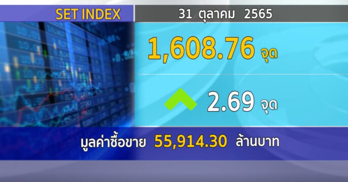 ตลาดหลักทรัพย์ ปิดวันนี้ที่ระดับ 1,608.76 จุด เพิ่มขึ้น 2.69 จุด (+0.17%) มูลค่าการซื้อขาย 55,914.30 ล้านบาท