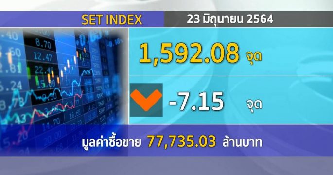 ตลาดหลักทรัพย์ ปิดวันนี้ที่ระดับ 1,592.08 จุด ลดลง 7.15 จุด (-0.45%) มูลค่าการซื้อขาย 77,735.03 ล้านบาท หลุด 1,600 รับแรงเทขายหลัง กนง.หั่น GDP กดบาทอ่อนค่าหนัก