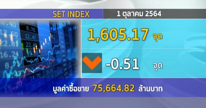 ตลาดหลักทรัพย์ ปิดวันนี้ที่ระดับ 1,605.17 จุด ลดลง 0.51 จุด (-0.03%) มูลค่าการซื้อขาย 75,664.82 ล้านบาท หุ้นไทยวันนี้ย่อตัวลงก่อนดีดขึ้นแล้วปิดเหนือระดับ 1,600 แกร่งกว่าตลาดต่างประเทศ