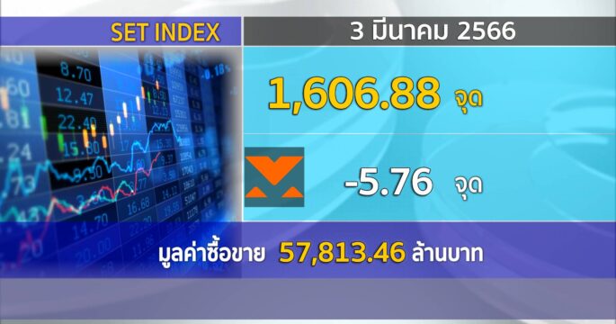 SET ปิดวันนี้ที่ 1,606.88 จุด ลดลง 5.76 จุด (-0.36%) มูลค่าการซื้อขาย 57,813.46 ล้านบาท