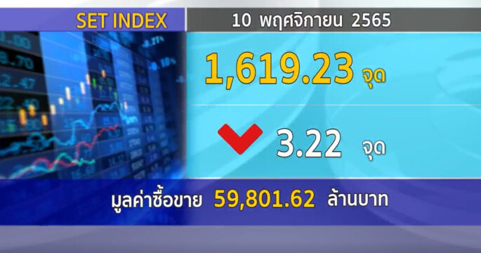 ตลาดหลักทรัพย์ ปิดวันนี้ที่ 1,619.98 จุด ลดลง 9.40 จุด (-0.58%) มูลค่าการซื้อขาย 61,524.93 ล้านบาท