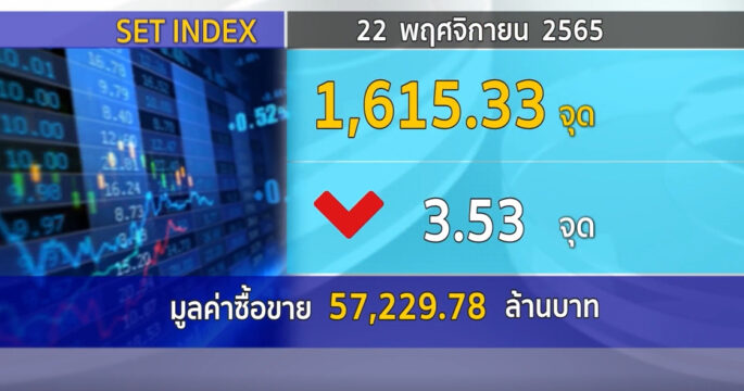 ตลาดหลักทรัพย์ ปิดวันนี้ที่ 1,615.33 จุด ลดลง 3.53 จุด (-0.22%) มูลค่าการซื้อขาย 57,229.78 ล้านบาท